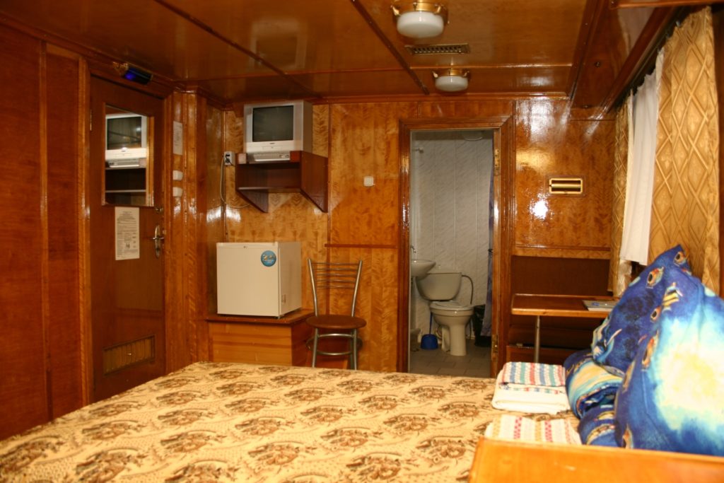 холодильник, видеодвойка для просмотра DVD, 2 обзорных окна. Каюта