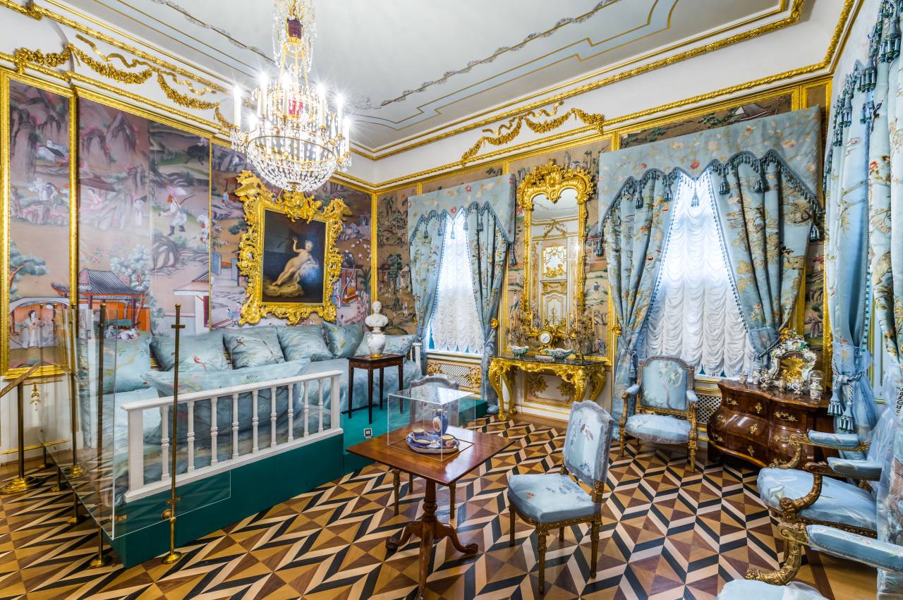 Первоначально интерьер комнаты создал Растрелли – золочёная резьба по дереву и стены, обитые шёлком. С середины XIX века панели и стены украшает ткань, изготовленная на московской мануфактуре И. Кондрашова (ныне воссоздана в мастерской под руководством А. Фейгиной).