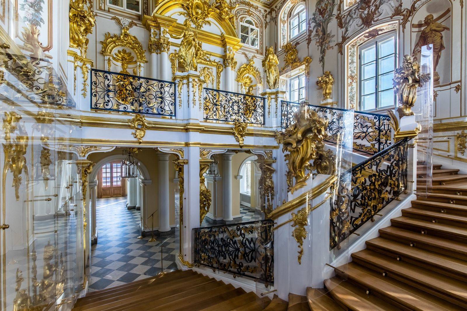 В отделке лестницы использована золочёная резьба, перила декорированы коваными решётками. Особенно нарядна многоцветная роспись стен, выполненная в 1751 году итальянцем А. Перезинотти.