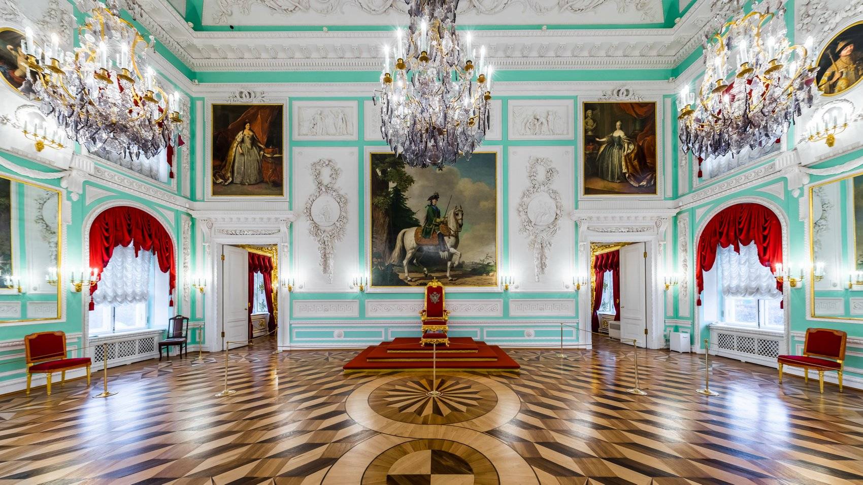 Над троном разместился парадный портрет царицы на лошади, созданный датчанином В. Эриксеном. Изображения родственников Петра I – Екатерины I, Анны Иоанновны и Елизаветы Петровны, написанные художником Г. Бухгольцем – по замыслу Екатерины, были призваны напомнить о преемственности власти.