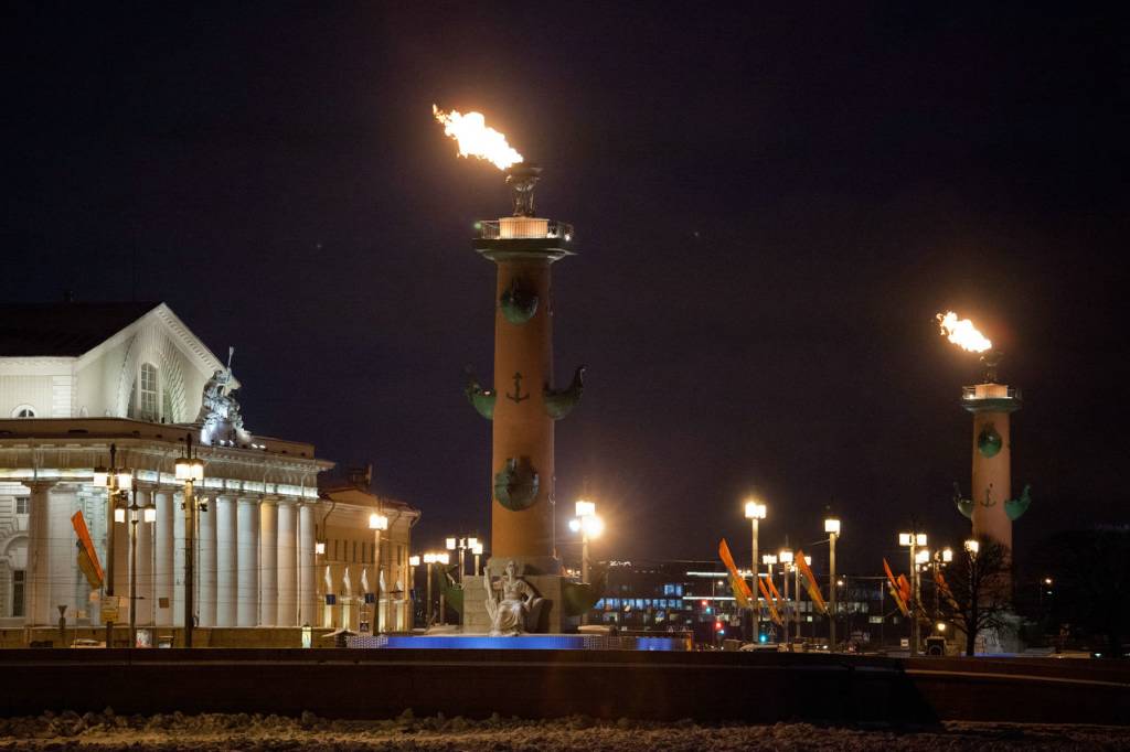 После революции 1917 г. колонны долго не освещались. В 1957 г. советское правительство провело их реставрацию к 250-летию Ленинграда и газифицировало. Впервые после реставрации их снова зажгли 23 июня 1957 г. Высота пламени в газовом сопле достигает 7 метров. Сегодня их обычно зажигают во время праздничных иллюминаций. Посмотреть на это зрелище туристы приезжают специально из других государств.