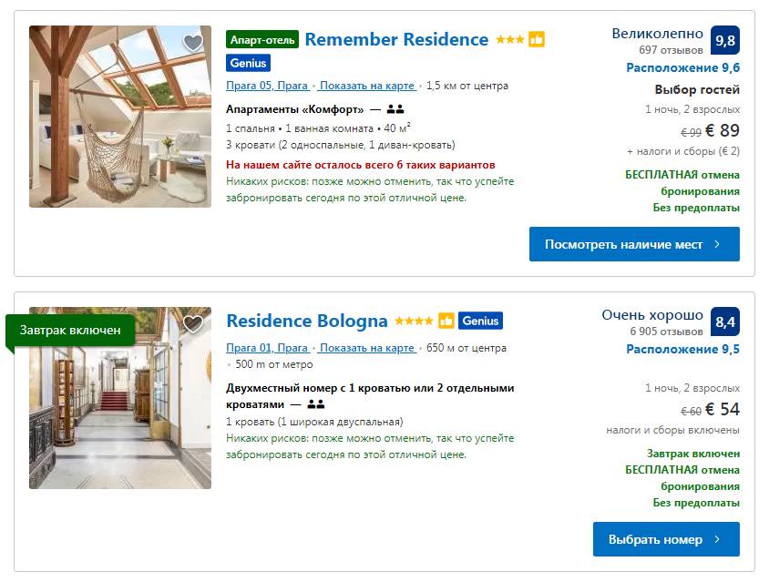 Как видите, «обычная» цена отеля зачеркнута и вместо нее стоит новая, со скидкой для участников программы Genius. О том, что данные отели предоставляют Genius’ам скидку, также говорит надпись на синем фоне рядом с названием объекта размещения.