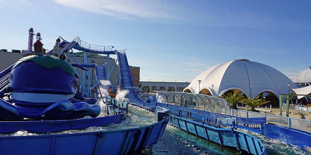 Морской аттракцион «Чудо-юдо Рыба-кит». Дух захватывает, когда твоя лодка несется с горки, а потом с брызгами падает в бассейн.