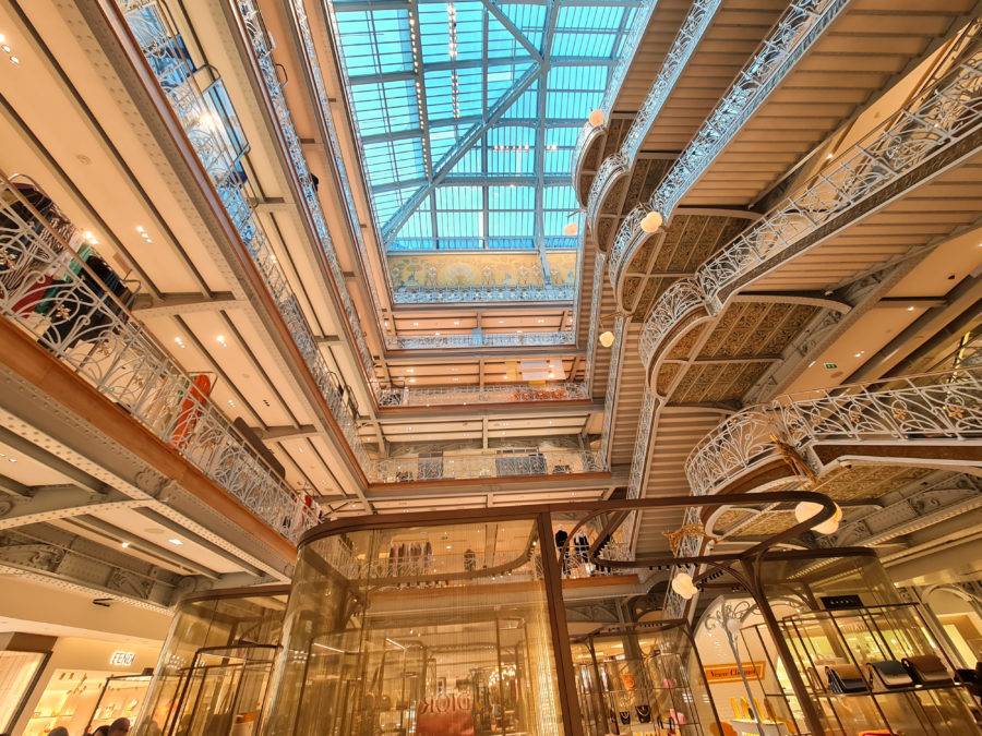 Сюда приходят не только за обновками, а чтобы полюбоваться самим зданием и видами, что открываются с высоты галереи на Монмартр и Оперу Гарнье, напротив которой она стоит. А когда наступает время рождественских праздников, в центральном зале появляется пышно украшенная огромнейшая елки.