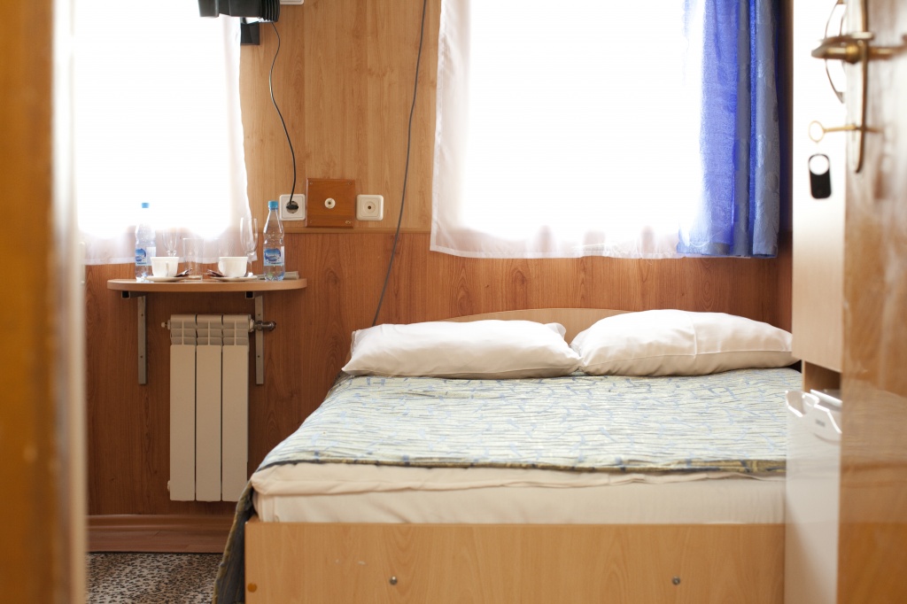 Во всех каютах есть шкаф, удобное спальное место (одно или два), санузел, где находится только раковина (кроме кают с улучшенной планировкой).