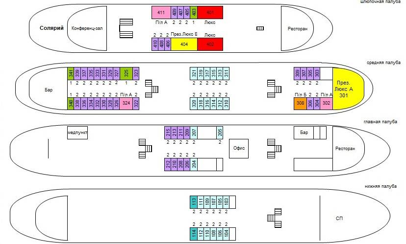 - Люкс «Илья Муромец», находящийся на схеме, на средней палубе предполагает размещение двоих путешественников. Это номер с двумя комнатами. Имеется дополнительное третье место для третьего туриста. Каюта № 301А с обзорными окнами.