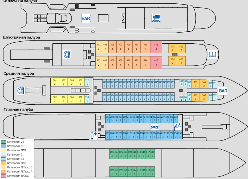 Корабль рассчитан на 307 пассажиров, из которых обычно 121 человек – это обслуживающий персонал. На верхней, средней, нижней, а также шлюпочной палубах предусмотрены каюты для путешественников. При желании туристы могут снять каюты класса полулюкс либо имеющиеся на корабле люксовые каюты.