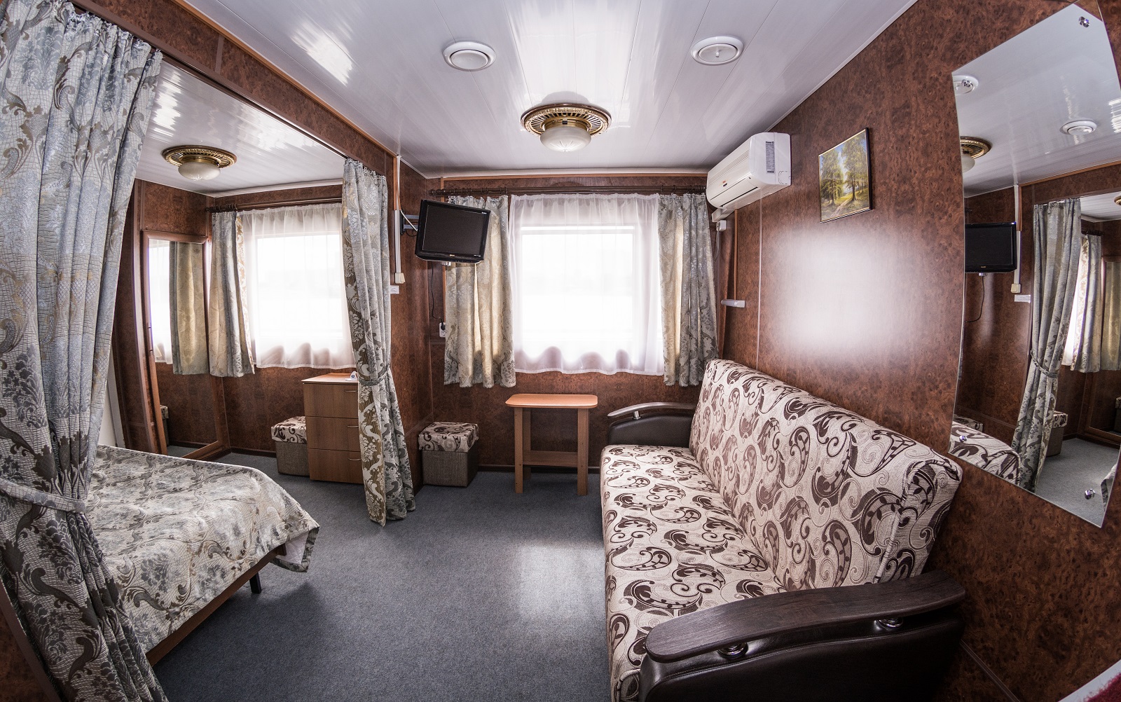 Просторная каюта большой площади с повышенной комфортностью, обзорными окнами и всеми удобствами (душевая кабина, фен, умывальник, туалет). В распоряжении проживающих будет двуспальная кровать, тумбочка, раздвижной диван, шкаф, кондиционер, холодильник, набор посуды и столовых приборов, питьевая вода, телевизор, банные халаты и тапочки.