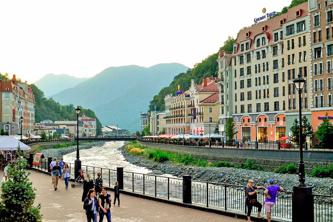 Далеко не всех тянет покорять вершины и наматывать километраж по лесам, лугам и горным склонам. Есть люди, которым хочется отдыха спокойного и размеренного. Эта категория туристов, оказавшись в Красной Поляне, предпочитает проводить время на набережной реки Мзымта. Неспешно прогуляться по набережной и соседним улочкам, полюбоваться стоящими здесь красивыми отелями и отобедать в одном из многочисленных здешних ресторанчиков – неплохая альтернатива и для тех, кто просто немного подустал от активного времяпрепровождения.