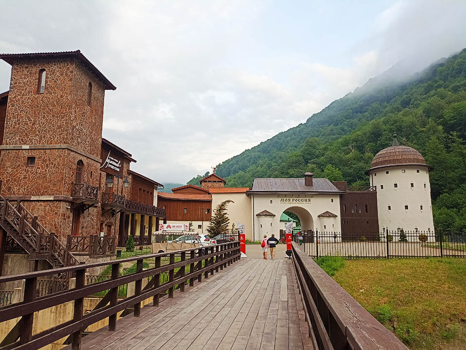 Культурно-этнографический центр «Моя Россия» расположился в самой дальней части курорта Роза Хутор. От конечной остановки общественного транспорта нужно пройти по набережной, не переходя реку, мимо концертного зала Rosa Hall и далее через парковку каршеринга. (Адрес: Набережная Лаванда, 9)Вход в комплекс платный. На территории расположились 11 павильонов, архитектурно соответствующие историческим постройкам разных регионов нашей страны. Внутри павильонов проходят выставки, мастер-классы. Есть кафе, магазинчики с национальными товарами и небольшие гостиницы. Экспозиции периодически меняются, но есть и постоянные.Если вы планируете подъем на канатной дороге Розы Хутор, то билет в Этно-парк в тот же день может быть включен, уточняйте в кассе.