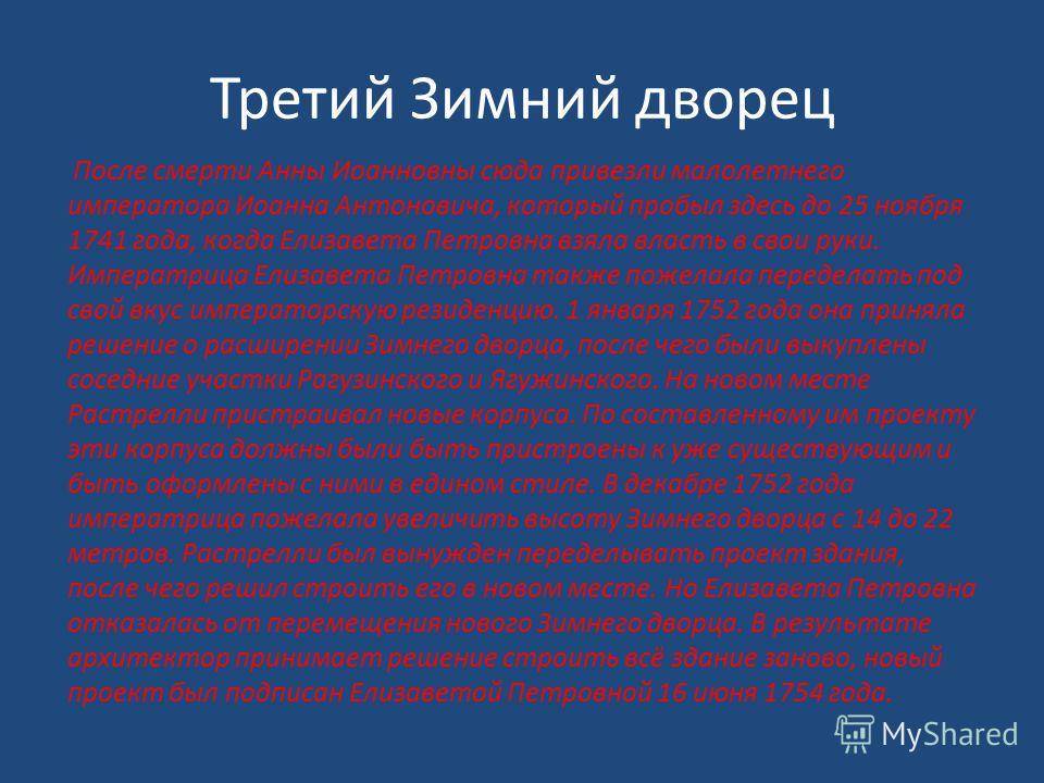Третий Зимний дворец После смерти Анны Иоанновны сюда привезли малолетнего императора Иоанна Антоновича, который пробыл здесь до 25 ноября 1741 года, когда Елизавета Петровна взяла власть в свои руки. Императрица Елизавета Петровна также пожелала переделать под свой вкус императорскую резиденцию. 1 января 1752 года она приняла решение о расширении Зимнего дворца, после чего были выкуплены соседние участки Рагузинского и Ягужинского. На новом месте Растрелли пристраивал новые корпуса. По составленному им проекту эти корпуса должны были быть пристроены к уже существующим и быть оформлены с ними в едином стиле. В декабре 1752 года императрица пожелала увеличить высоту Зимнего дворца с 14 до 22 метров. Растрелли был вынужден переделывать проект здания, после чего решил строить его в новом месте. Но Елизавета Петровна отказалась от перемещения нового Зимнего дворца. В результате архитектор принимает решение строить всё здание заново, новый проект был подписан Елизаветой Петровной 16 июня 1754 года.