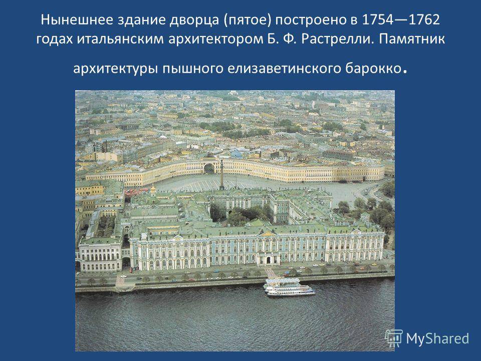 Пятый (существующий) зимний дворец В 1762 году появилось существующее в настоящее время здание дворца. В то время Зимний дворец стал самым высоким жилым зданием в Санкт-Петербурге. Здание включало в себя около 1500 комнат. Елизавета Петровна не дожила до окончания строительства, принимал работу 6 апреля 1762 года уже Пётр III. К этому времени была закончена отделка фасадов, но многие внутренние помещения ещё не были готовы. Летом 1762 года Петра III свергли с престола, окончено строительство Зимнего дворца уже при Екатерине II.