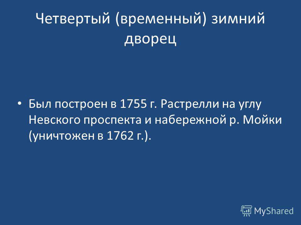 Четвертый (временный) зимний дворец Был построен в 1755 г. Растрелли на углу Невского проспекта и набережной р. Мойки (уничтожен в 1762 г.).