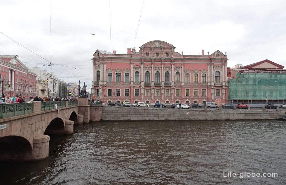– с юго-восточной стороны моста, на углу Невского проспекта 41 и набережной реки Фонтанки 42, находится одно из самых прекрасных зданий на Невском проспекте – дворец Белосельских-Белозерских – бывший особняк и памятник архитектуры в стиле нового барокко.