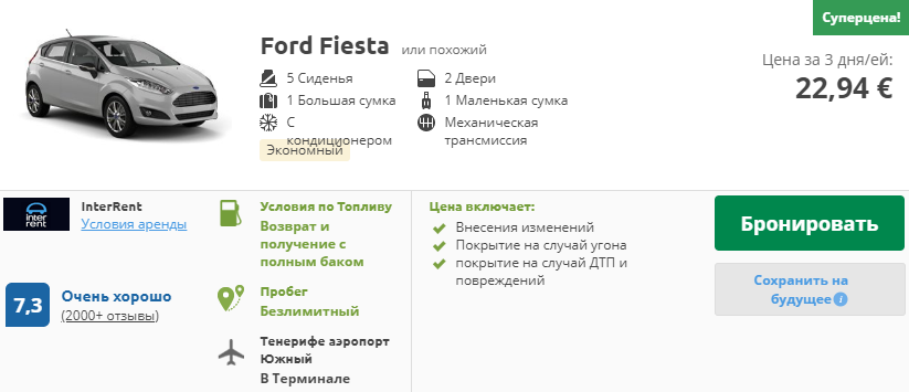 Давайте посмотрим цены в сервисе Rentalcars.com. Возьмем для примера 3 дня аренды. Как раз хватит, чтобы объездить основные достопримечательности Тенерифе и пляжи. Цена в евро, отсортированы варианты по стоимости.