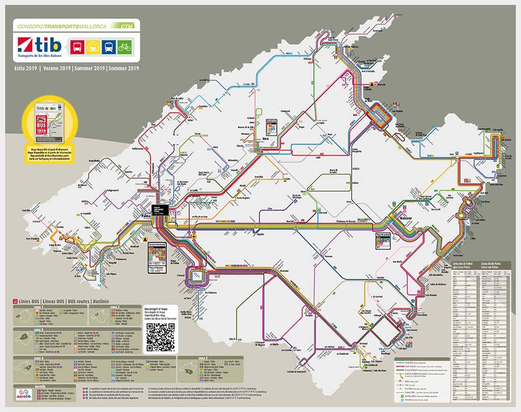 Автобусная сеть полностью охватывает остров, соединяя практически все города, деревни и прибрежные районы Майорки. Центральную область и основные курорты обслуживает компания EMT (Empresa Municipal de Transports Urbans de Palma de Mallorca), а мелкие городки и поселки соединены сетью частных маршрутов. С мая по октябрь автобусы ходят каждый час, зимой движение ограничивается до пары раз в день. Подробную информацию о маршрутах можно посмотреть на официальном сайте TIB (Transports de les Illes Balears).