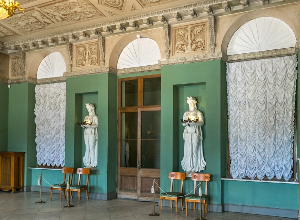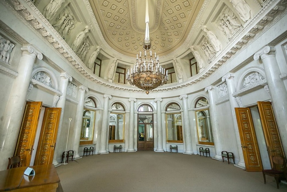 Самое эффектное помещение первого этажа – Овальный зал с пятью высокими и широкими окнами. Купол зала, украшенный росписью и бронзовой люстрой, поддерживают кариатиды.
