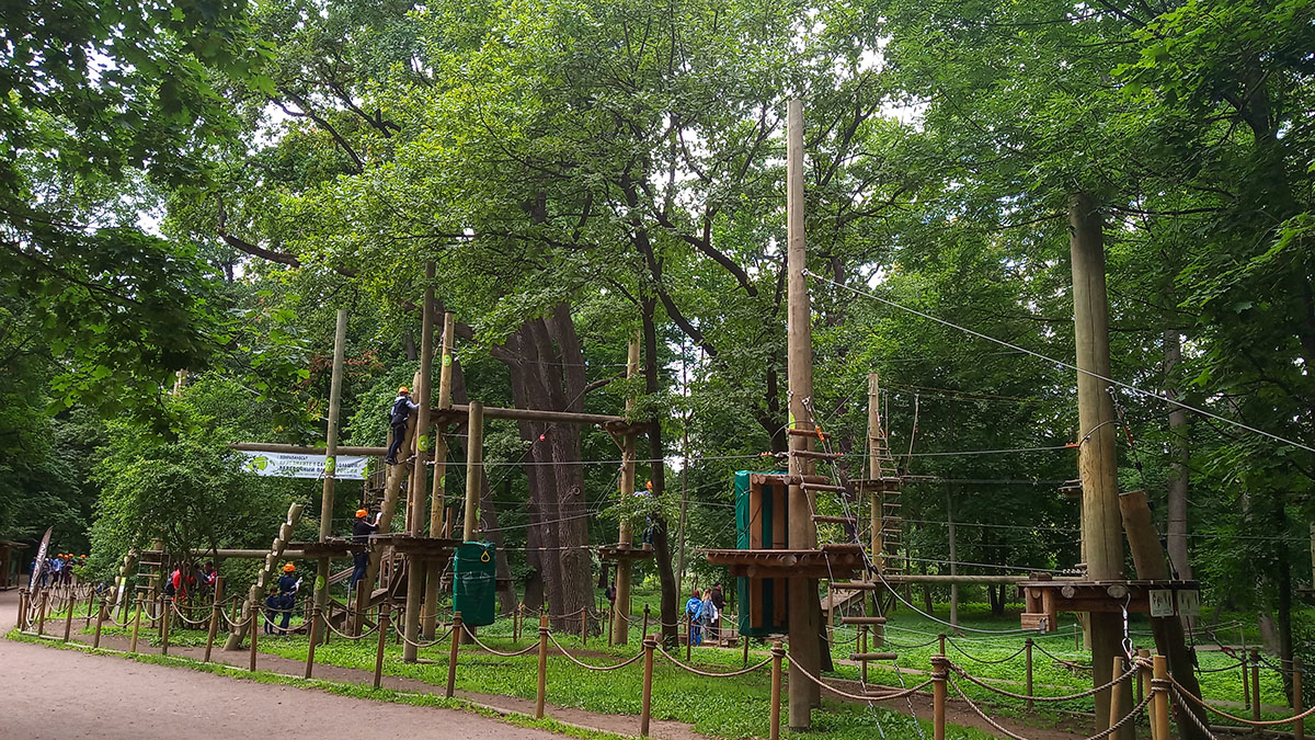 Для детей там еще есть замечательное развлечение – веревочный парк. Ребенку выдадут каску, наколенники и страховочные веревки – и ползай на здоровье по канатам и бревнам. А для совсем маленьких детей есть хорошая детская площадка, она расположена посередине между мостами с Приморского проспекта и с Крестовского острова, рядом с центральной аллеей, соединяющей эти два моста.