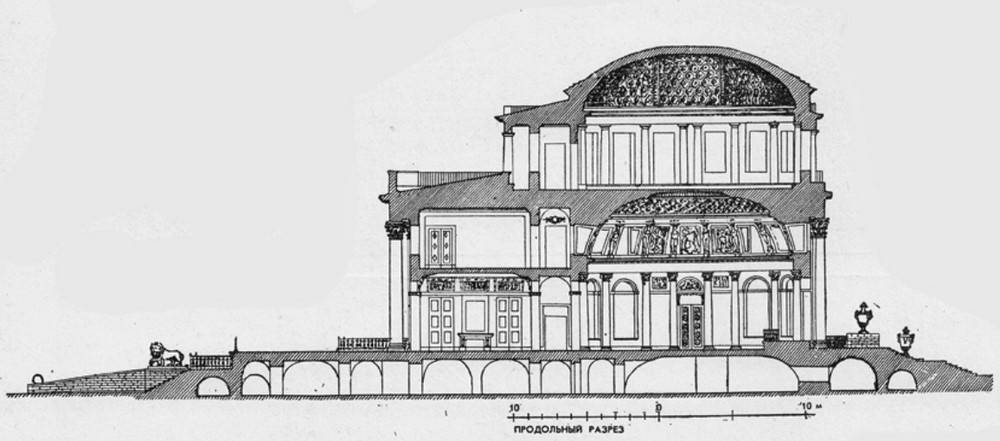 Фасад здания роскошно украшен. Коринфский портик западного фасада дополняется аттиком и плоским куполом. Полуротонда восточной части украшена колоннами и двумя портиками. Боковые фасады украшают треугольные фронтоны и те же колонны — по четыре с каждой стороны. Воздушность зданию добавляет выбор цветов. Сочетание голубого и белоснежного делает массивные постройки невесомыми. Те же оттенки используются и в декоре технических помещений.