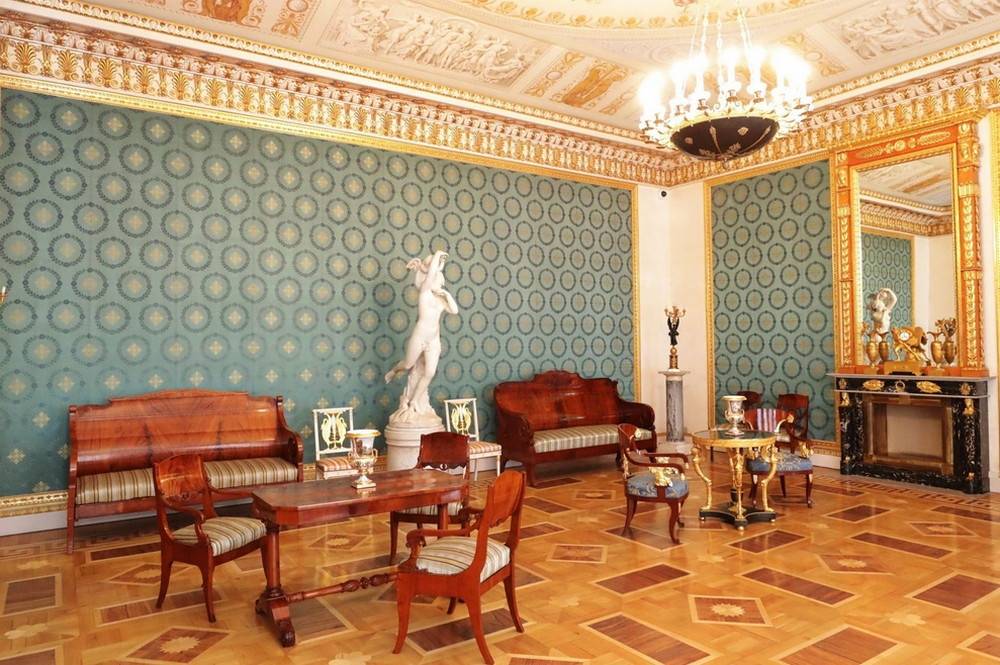 Семья Романовых владела дворцом до начала XX века. На первом этаже – анфилада Парадных залов, торжественных, нарядных, похожих на изящную драгоценную шкатулку. В парадных помещениях – 20 дверей, облицованных драгоценными породами дерева и украшенных тонкой золочёной резьбой.