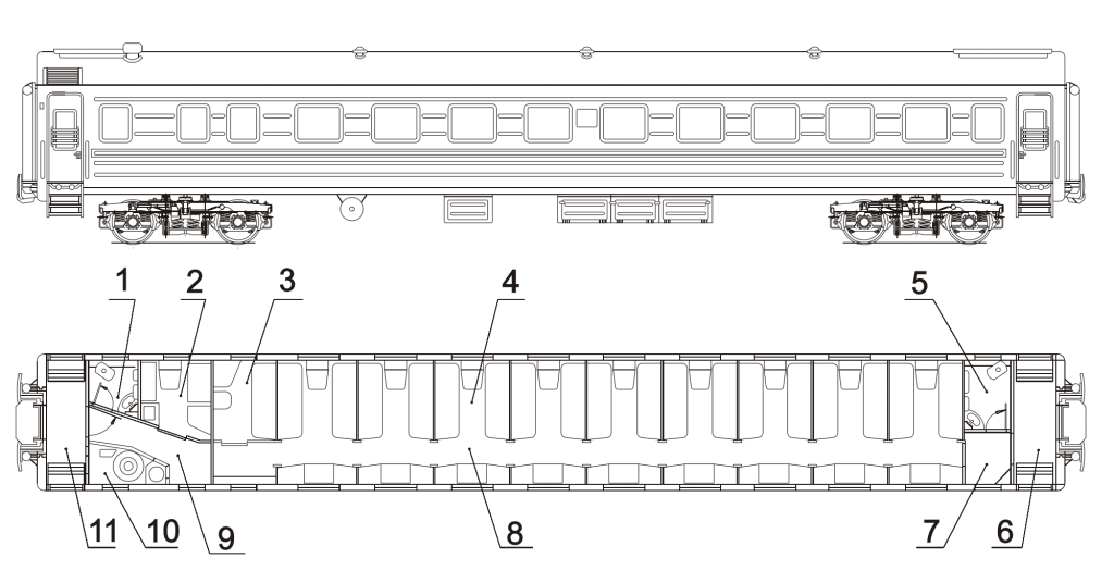 Кроме пассажирских мест, плацкартный вагон имеет 2 туалета, купе проводников, служебный отсек, нагреватель воды, отделение для контроля над системой отопления.