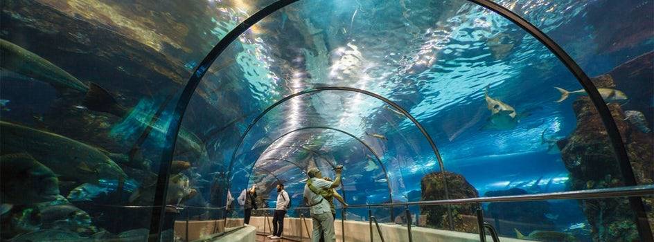Дно аквариума выполнено таким образом, что под ним можно ходить и наблюдать за плавными движениями рыб, привлечь их внимание сквозь стекло и сфотографироваться на фоне ската или даже акулы, нос которой будет упираться прямо вашу руку. Здесь можно любоваться опасными хищниками моря и абсолютно не волноваться за свою жизнь
