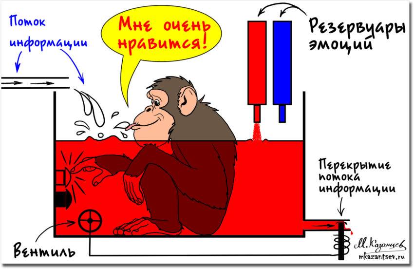 Для начал она ее пробует «на вкус». Если информация вызывает у обезьяны положительные эмоции, то она окрашивает информационный поток позитивом. Если информация обезьяне не нравится, то она добавляет другую краску, которая соответствует негативным эмоциям. Но это еще не все. Пока эмоции у обезьяны не слишком сильные, она всего лишь дергает туда-сюда рубильником, который определяет, какую краску добавить в прозрачный информационный поток.