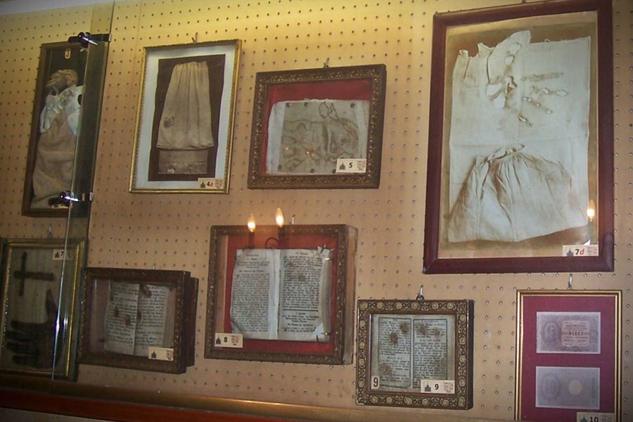 Перед этим еще надо попросить разрешения священника – сказать ему: «Il museo», и падре проводит вас к экспозиции. Она началась в 1912 году с ночного колпака. По легенде, в 1873 его хозяин овдовел, но трауру не предался, а предался плотским развлечениям. За что однажды и был наказан ревнивой покойницей, которая ночью явилась к нему в комнату, дернула за нос и сорвала с головы колпак. Наутро бедный вдовец увидел на головном уборе черные отпечатки рук.
