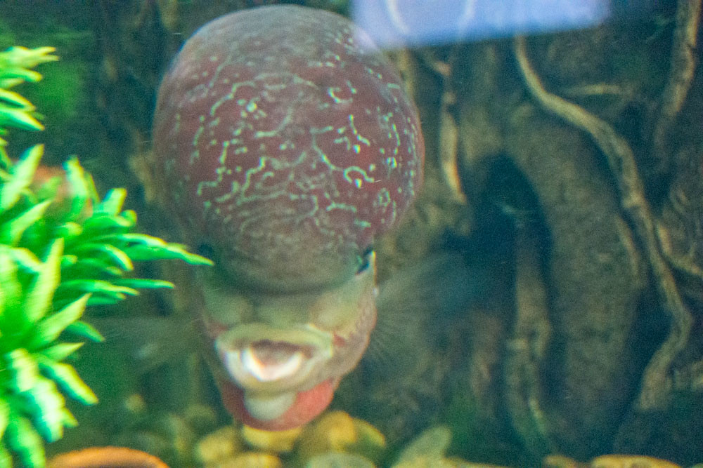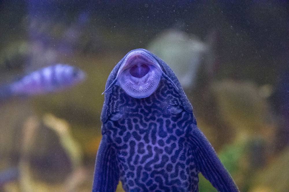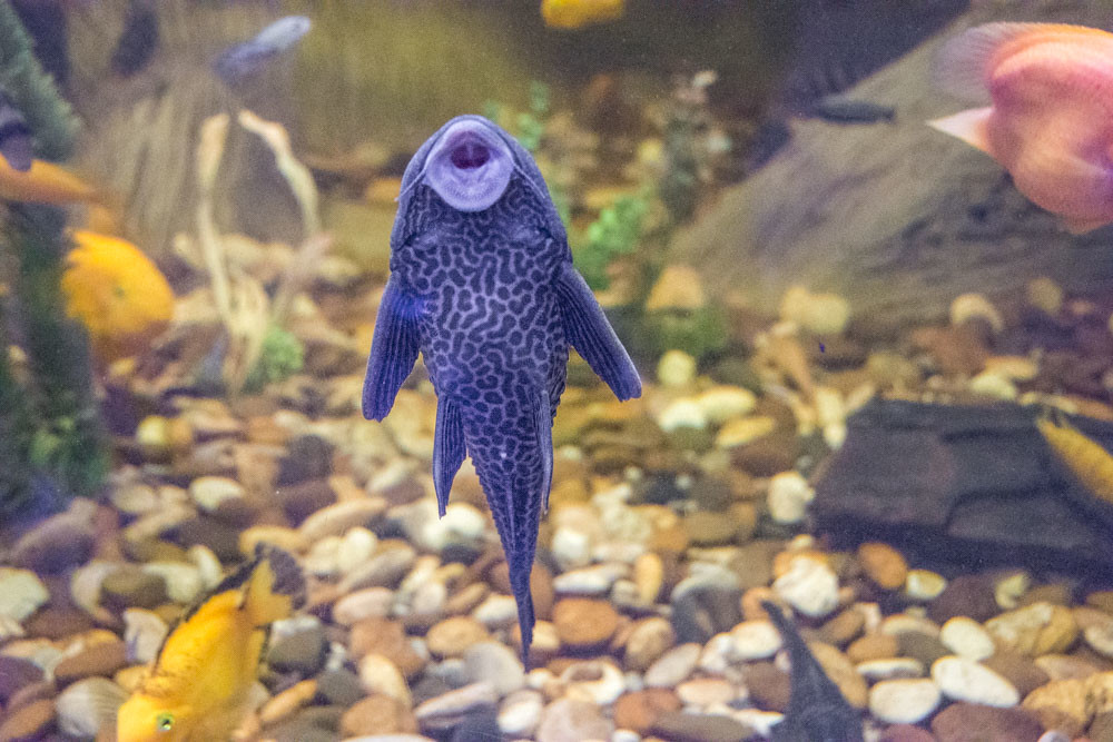 А этот сувак присасывается ртом к стеклу аквариума и висит.