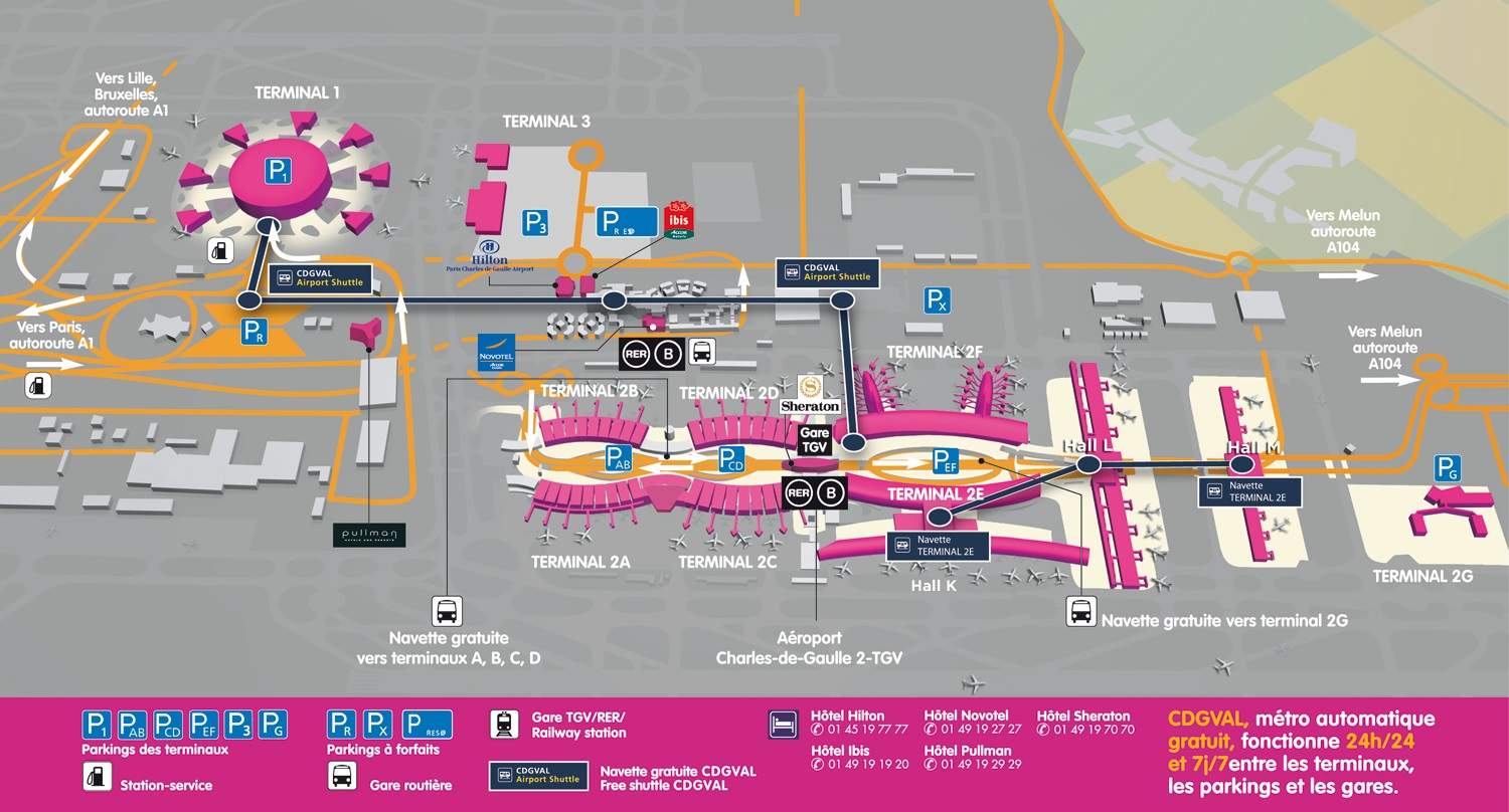 Внутренний бесплатный транспорт курсирует между терминалами с небольшим интервалом 5-8 минут. Схема аэропорта Шарль де Голль поможет разобраться с расположением их станций и периодичностью движения, а также скоординировать сообщение с городом.