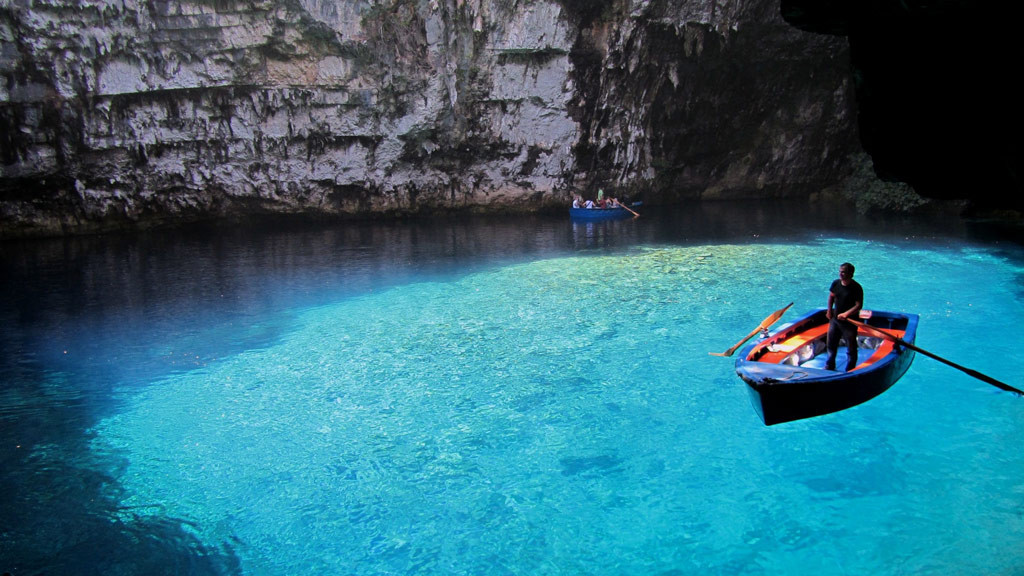 - Фантастическое озеро Мелиссани с пронзительно голубой водой. Говорят, этот цвет воде дают местные уникальные водоросли. Раньше Мелиссани было подземным озером, но многие тысячи лет назад «крыша» пещеры провалилась, и теперь озеро находится не под землей, а на дне глубокого пролома. На солнце необыкновенная вода озера кажется еще более голубой и красивой. И здесь хорошо. А если направить лодку в глубину пещеры, куда солнце не заглядывает, то становится немного страшно. Неспроста в микенскую эпоху Мелиссани считалось убежищем козлоногого Пана.