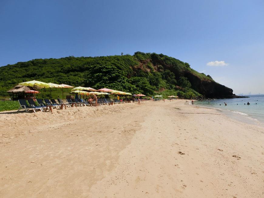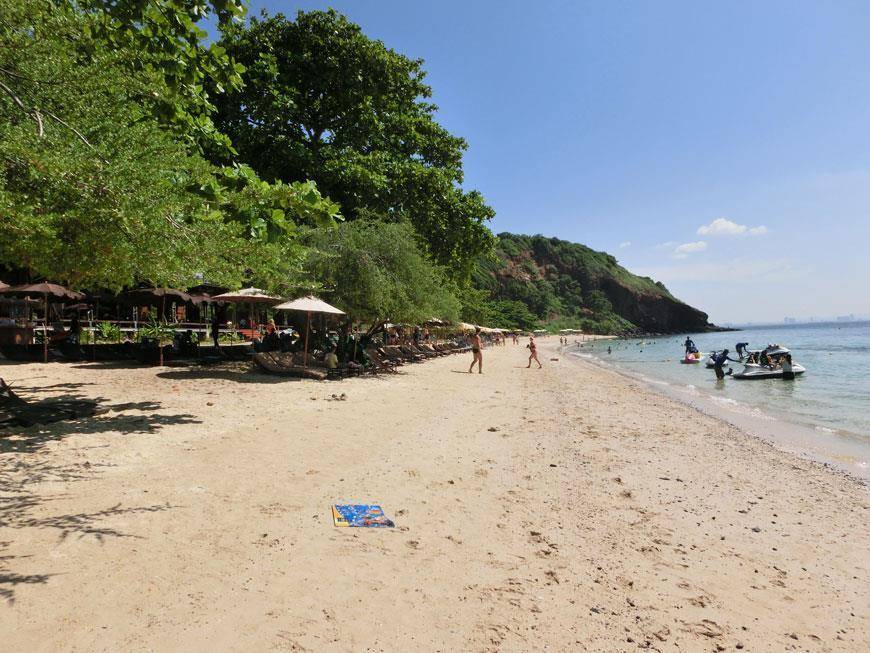 Минус – высокая посещаемость пляжа. Туристы прибывают непрерывным потоком, транспорт гудит, люди кричат, на пляже вечное движение. Из-за этого грязновато – по сравнению с другими пляжами Ко Лан. Лавки тянутся вдоль всего берега, 200 шезлонгов «толпятся» в несколько рядов (но зато и аренда недорогая: 30-50 батов). Для тех, кто не боится шума и не бежит от людей – ничего страшного, а вот искателям уединения – точно не сюда.