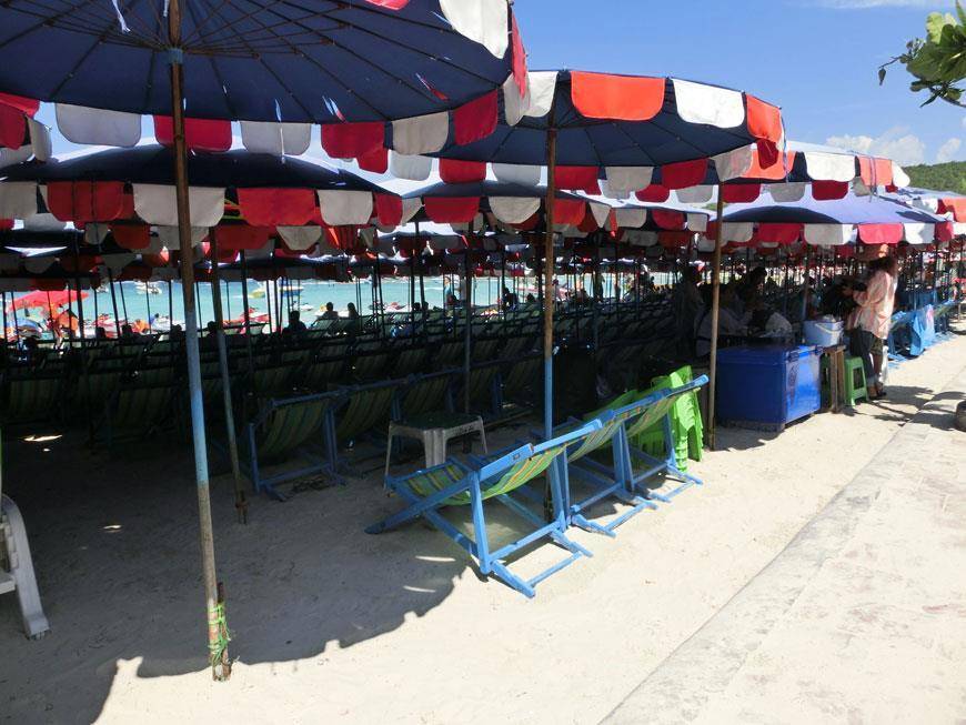 5) Цены на шезлонги почти везде 100 бат (пластиковые, лежачие), деревянные, сидячие — 50 бат, но не везде они есть.