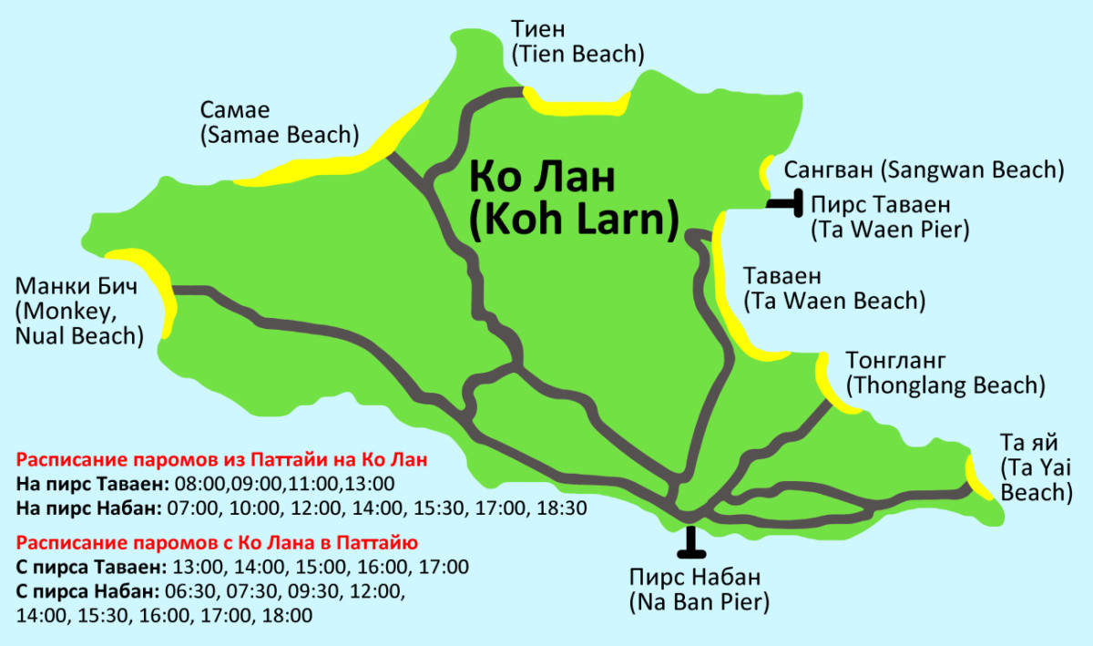 Более дешевый вариант – паром с центрального пирса Паттайи Бали Хай. Средняя стоимость билета составляет 30 бат в одну сторону. Путешествие морем на пароме занимает не более 40 минут. На Ко Лане морские суда швартуются у пирсов Таваен и Набан. Посмотреть расписание рейсов можно на карте острова ниже: