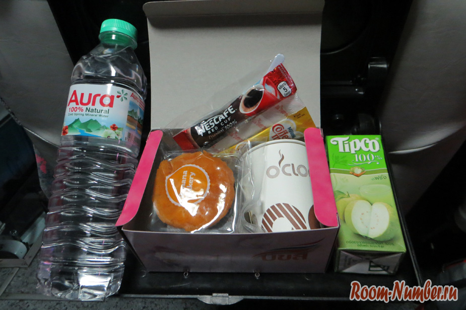 Первым делом, как только мы уселись на свои места, милая девушка принесла нам по бутылке воды, а также выдала каждому по коробочке с растворимым кофе, печенками, банановым мини-кексикок и соком из гуавы. Мы все съели. Ну кроме сока.. ! До сих пор пробуем какие-то продукты впервые.