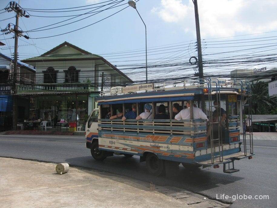 Общественный транспорт Пхукета развит вполне неплохо. Добраться с пляжа на пляж и до многих достопримечательностей можно на местных автобусах – сонгтео. Автобусы, следующие на пляжи синего цвета, проезд, в среднем, стоит 40 бат. Такие небольшие автобусы без окон и дверей с лавочками в салоне.