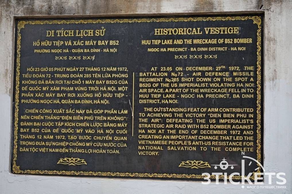 Это малоизвестная достопримечательность, но все-таки советуем ее посетить. Находится примерно в 15 минутах езды от центра Ханоя, в квартале Нгокха. Не зная, что здесь такой памятник, можно запросто пройти мимо этого озера: выглядят останки самолета просто как мусор в озере. Но зная историю, видеть эти обломки довольно волнительно.