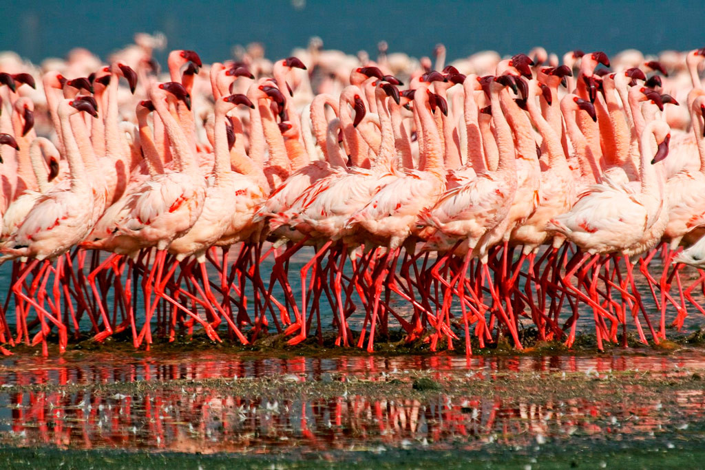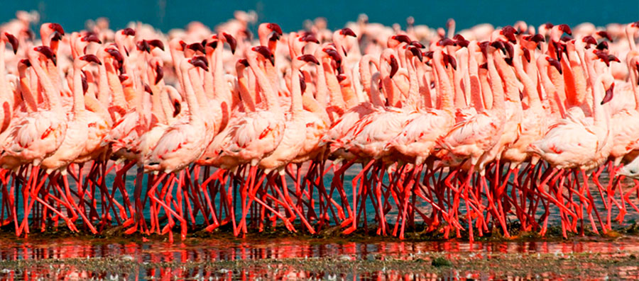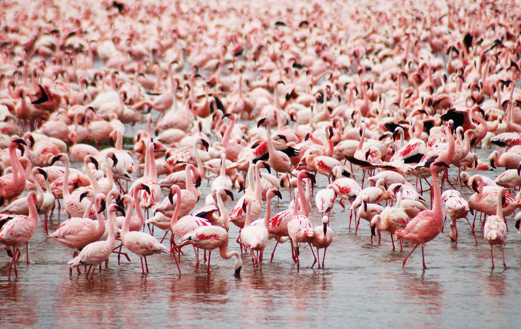 Проходит время и непригодные для многих представителей животного мира воды озера и пыльные берега словно преображаются. Практически вся их поверхность приобретает розоватый оттенок, а в воздухе отчетливо слышатся миллионы пронзительных птичьих криков. Словно живое розовое одеяло покрывает воды озера Накуру.