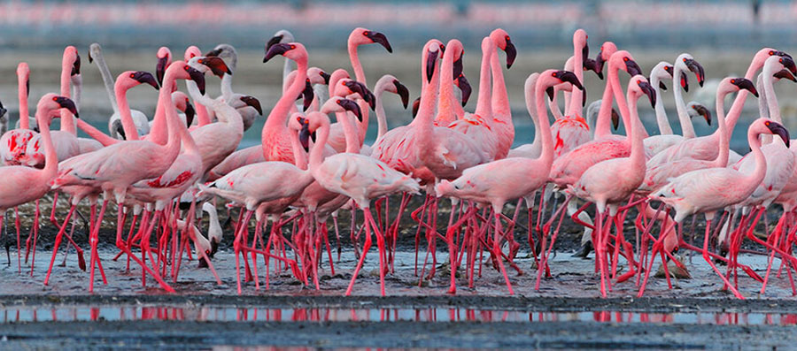 Казалось, что сможет выжить в таких суровых условиях? Действительно, соленые воды смогли покориться лишь некоторым видам водорослей и мелким ракообразным. И именно они являются излюбленной пищей малых фламинго, которые с удовольствием, в компании миллиона себе подобных, снуют по мелководью и насыщаются этими дарами природы. Этих красивых птиц здесь больше, чем в любом другом уголке планеты. Именно они создают ту сказочную картинку, которая с высоты птичьего полета кажется живой и постоянно меняет свои оттенки.