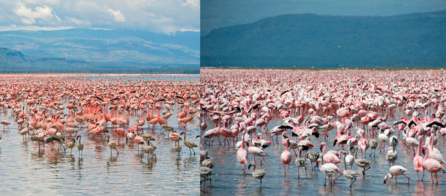 При приближении к озеру Накуру кажется, что его поверхность имеет розовый цвет. Но стоит подойти ближе как становится ясно, что розовой поверхность воды делают огромные стаи фламинго. На самом деле вода в этом соленом озере имеет зеленый цвет из-за большого количества сине-зеленных водорослей. Именно этими водорослями и питаются здесь фламинго. За год стаи фламинго съедают около 250 т водорослей. Но в озере их не становится меньше.