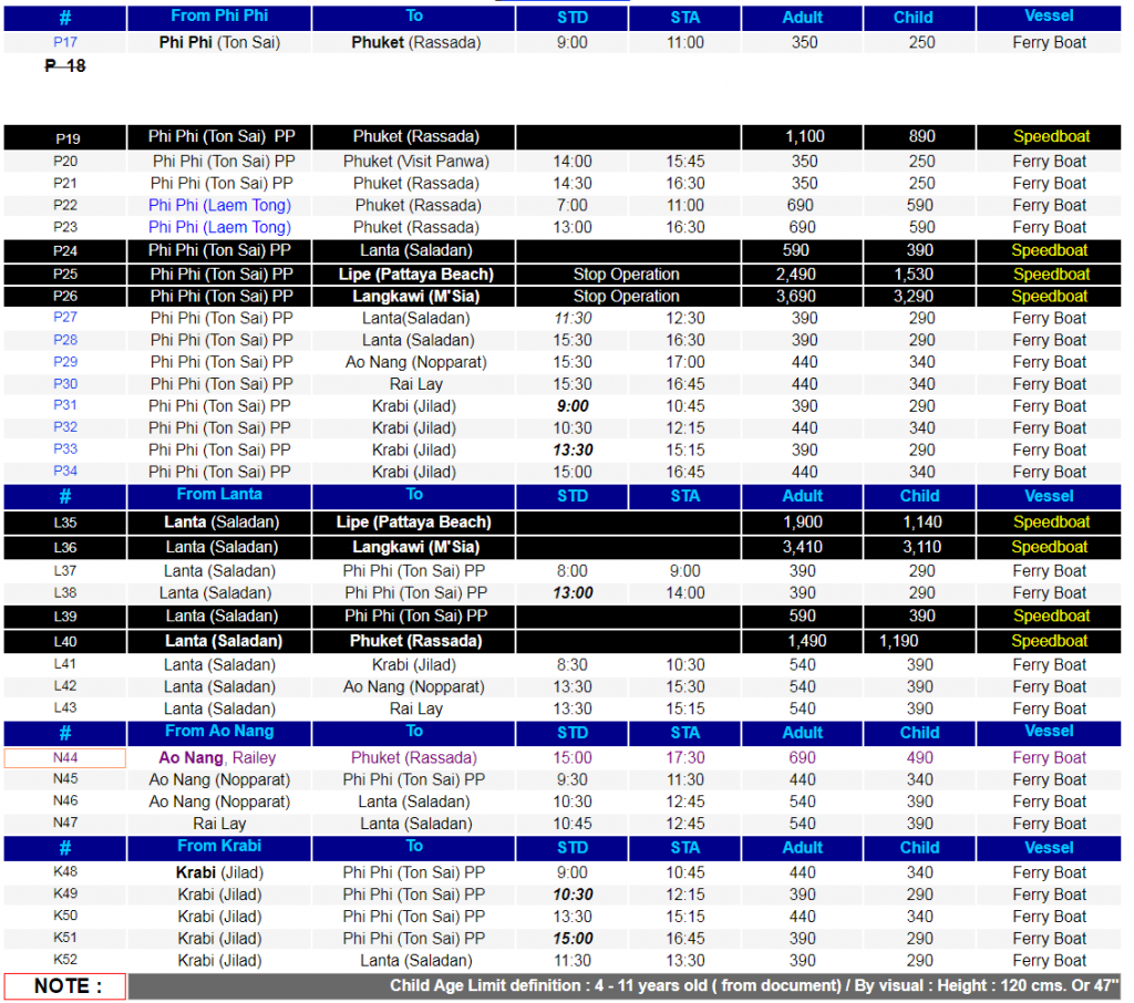 - Пхи Пхи – Рейли и Ао Нанг в 15:30 (прямой паром в Рейли и на пирс Ноппарат Тара) и в 10:30 паром в Краби с последующим бесплатным трансфером в Ао Нанг