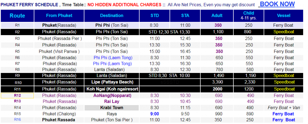 А это расписание обратных паромов до Пхукета из разных точек Таиланда: