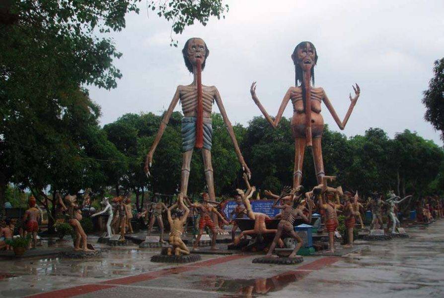 Но тянет всех посетителей, конечно, в адский сад, где в красках показана участь, которая постигнет на том свете любого, нарушившего буддистские заветы. Безумные пытки, сожжение на кострах и варка в котлах, безобразные чудовища, пожирающие грешников. Холодящие кровь картины, открывающиеся взору в адской части экспозиции, поражают воображение и вызывают вопросы о вменяемости придумавших все эти ужасы.