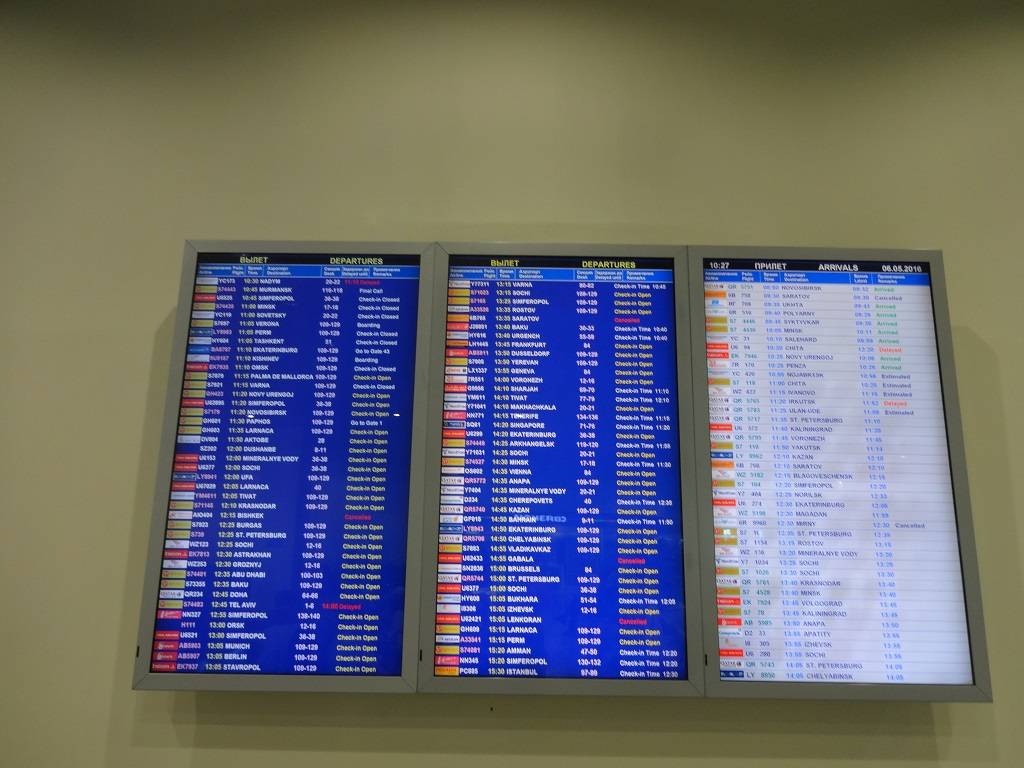 Добравшись до аэропорта, нужно найти в его зале электронное табло, где содержится информация о вылетающих в ближайшее время рейсах. Обычно табло размещается недалеко от входа на видном месте. Английский вариант названия — «Departures». Чтобы сориентироваться, надо искать в списке номер своего рейса, далее по строке его состояние на данный момент.