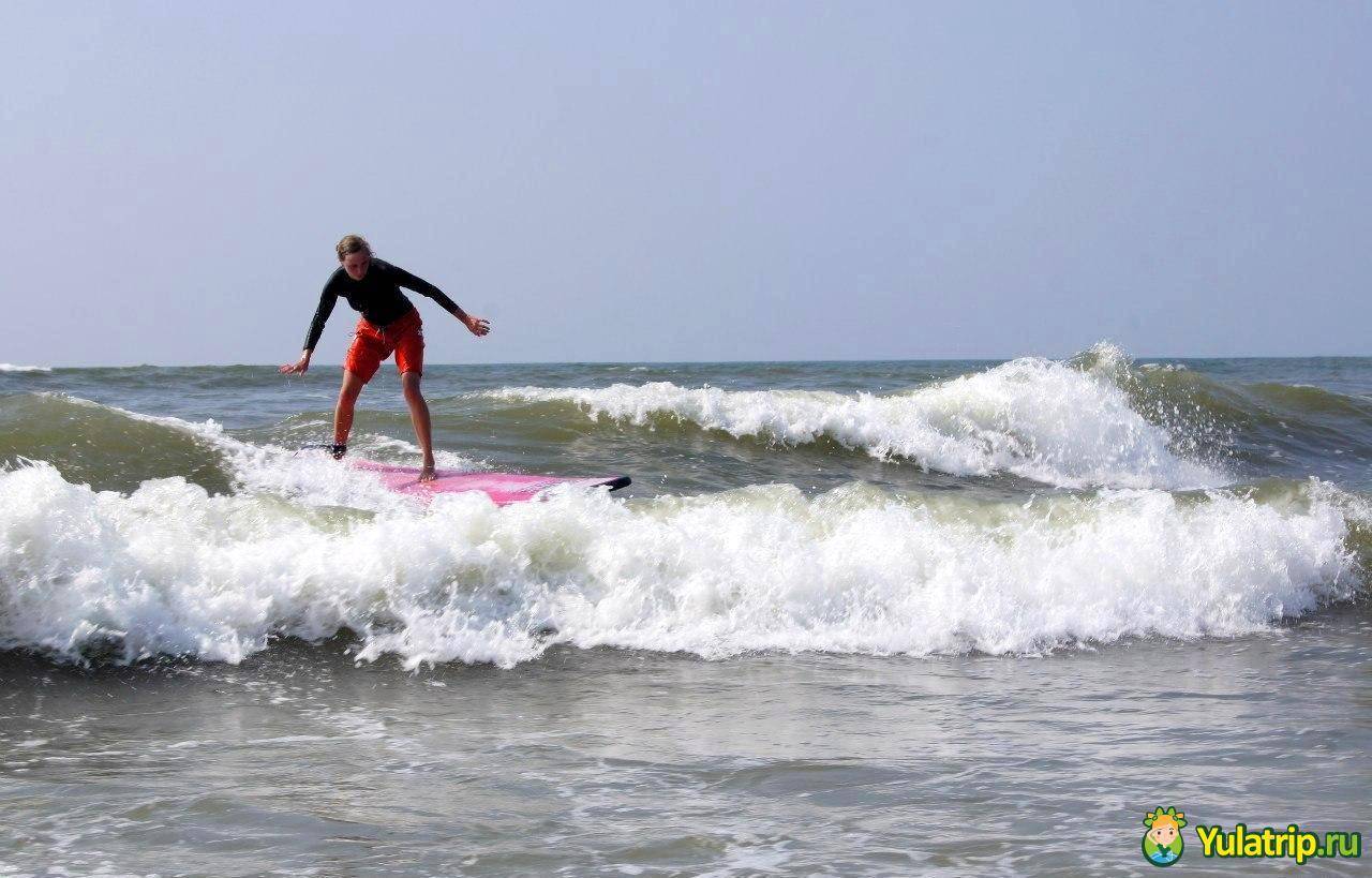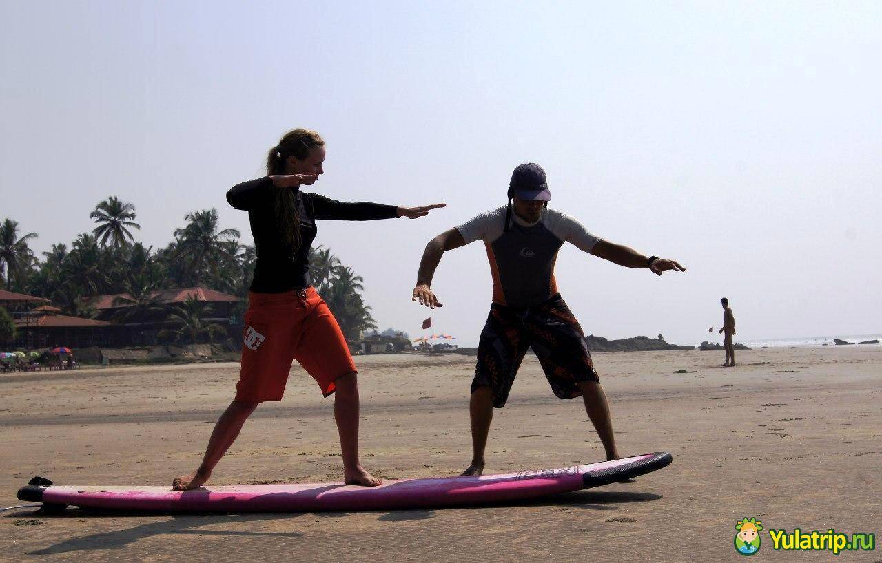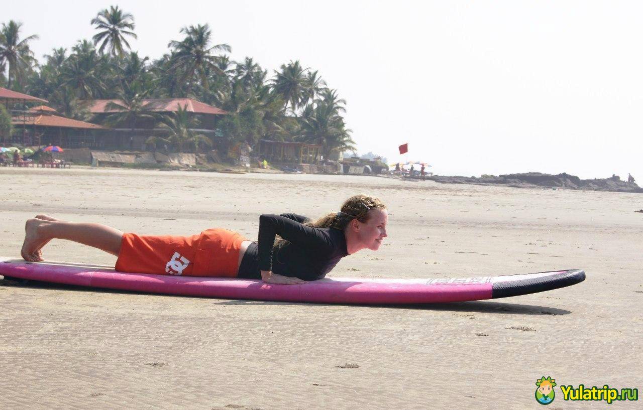 Второй раз я уже не помню получился ли, вроде бы да, но после этого я стала постоянно падать с доски еще не успев толком и встать. Сказывалась усталость от постоянной борьбы с волнами. В итоге 40 минут в воде пролетели не так быстро как мне казалось изначально, вообще общая картина выглядит так — я минут 5-7 иду до лайн-апа потом, пытаюсь встать на волне, если встаю- хорошо. Если нет -падаю и мне снова нужно идти до лайн-апа. Представляете, да? И 5-7 минут до лайн-апа это в самом лучшем случае. Но мы же не из трусливых. В итоге 40 минут закончились, и мое занятие тоже. Инструктор сказал,что у меня очень хорошо получается, и пригласил еще на занятия, но это был наш последний день в Гоа. Очень жаль. Но именно после этого первого урока на серфе я по-настоящему «заболела» серфингом и в будущем думая об отпуске я всегда искала страны, где есть океан и волны для серфинга.