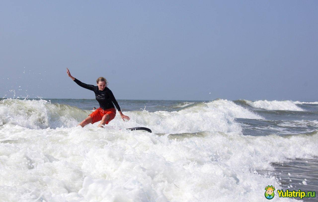 20 минут теории и вот я уже иду в воду, покорять свою первую волну! Сначала нужно было добраться до лайн-апа — места, откуда нужно ждать своей волны. Это оказалось довольно-таки сложно, я и не представляла сколько физической силы нужно серферам. Когда на тебя обрушивается волна, нужно делать все технически правильно, иначе волной может сильно ударить. И это постоянное 3 шага вперед — волна обрушивается и 4 шага назад, потом снова вперед и снова волна. Ух, я вся в соли, успевала только протирать глаза. Вот вроде мы и дошли до лайн-апа и инструктор сказал мне ложиться на серф и по его команде вставать. Я легла и приготовилась — и вот я чувствую как меня начинает нести вперед и через пару секунд инструкторское — «Вставай!». Я не задумываясь попыталась встать так как меня учили на берегу — и ребята, у меня получилось с самого моего первого раза встать и проехать 3-4 секунды на волне! Боже, я была так ошарашена этим и так счастлива, что я смогла, у меня получилось! Инструктор одобрительно мне кивнул, кое-что подправил в моих действиях и вот я снова иду на лайн-ап — волны к тому времени разыгрались не шуточные, совсем не для новичков. Но другого шанса не будет! Нужно все делать здесь и сейчас!