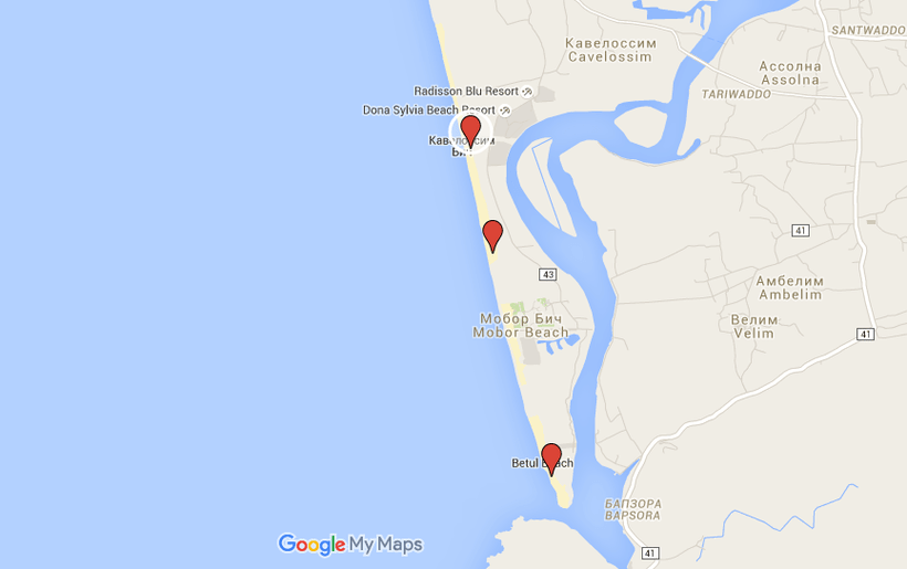 На карте Кавелоссима обозначают несколько пляжей – это сам Кавелоссим, а также Мобор и Бетул (отмечены на карте по порядку, Кавелоссим сверху). Но на самом деле все их можно считать одним пляжем. Больше всего шеков расположено в Моборе, а жизнь вне моря и пляжа развита в Кавелоссим-бич.