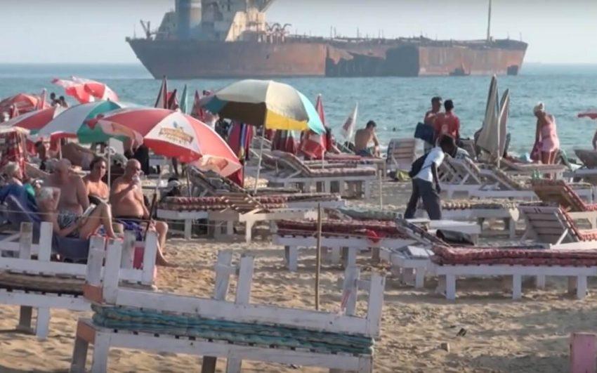 Береговая линия не больше двух километров с желтым песком. Пологий вход в море, всегда небольшие волны, которые поднимают песок, вода редко бывает прозрачной.