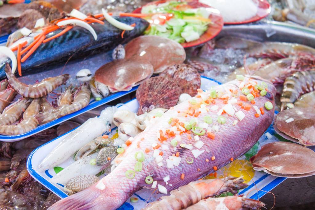 Украшенная рыба и морепродукты в ресторане о. Фукуоке, Вьетнам