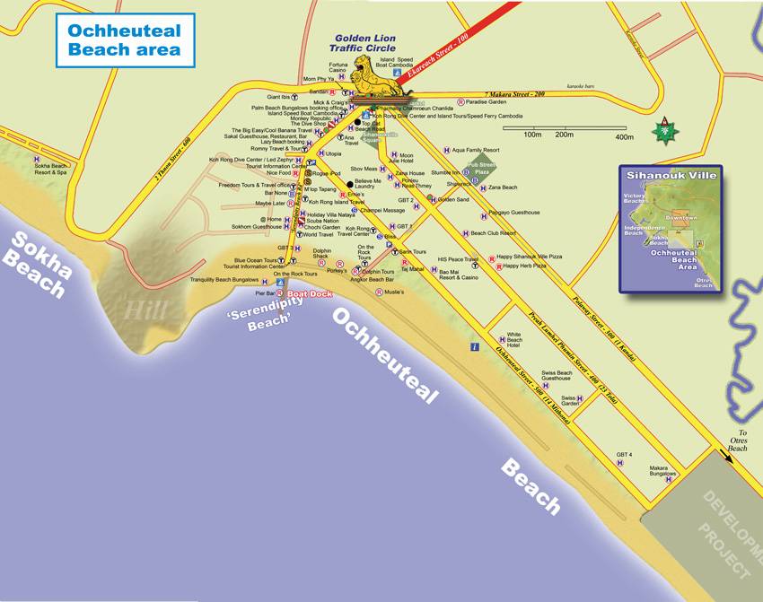 Самыми туристическими пляжами являются Серендипити и Очеутал бич (Serendipity and Ochheuteal beach). Оба они находятся в центре Сиануквиля, имеют отличную инфраструктуру и застроены отелями и всяческими увеселительными заведениями для туристов. Из туристов здесь, конечно же, львиная доля русских, причем не только туристов, приезжающих на неделю-две погостить, а людей, живущих тут сезонами и даже годами. Кроме русских тут достаточно канадцев французов, китайцев и вьетнамцев. Достаточно много тайцев, приезжающих сюда поиграть в азартные игры (как я писала ранее, азартные игры в королевстве Таиланд запрещены).
